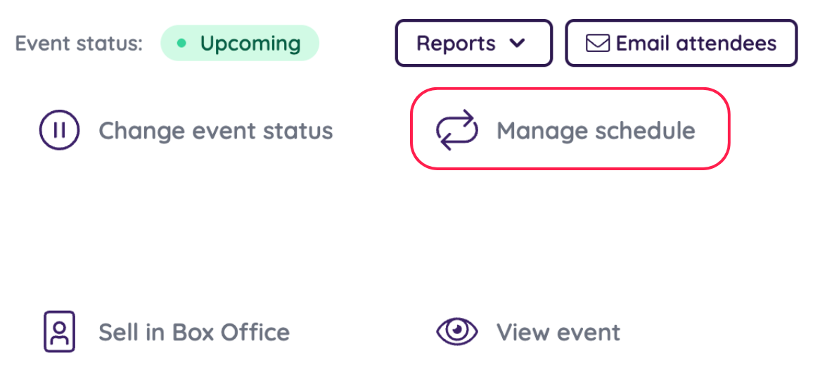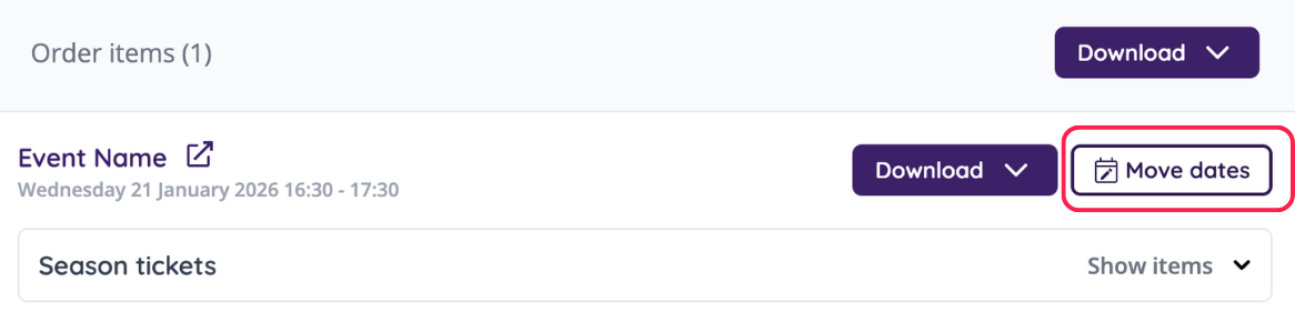 Scenario: a customer has bought tickets for an event and wants to change their booking to attend the same event on a different date. Assuming these repeating events are grouped in a schedule, you can simply move the dates from one event to another.