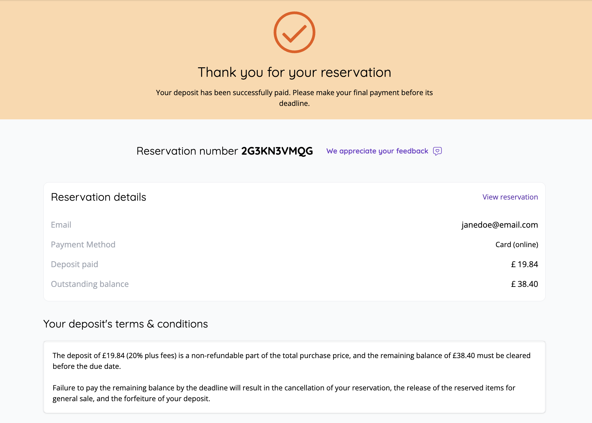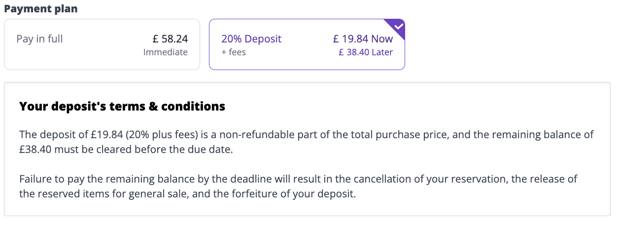 Deposits act as a non-refundable percentage of the total order purchase price. If a customer fails to pay within the given timeframe, their order will be automatically cancelled, and all items will be returned to general sale.