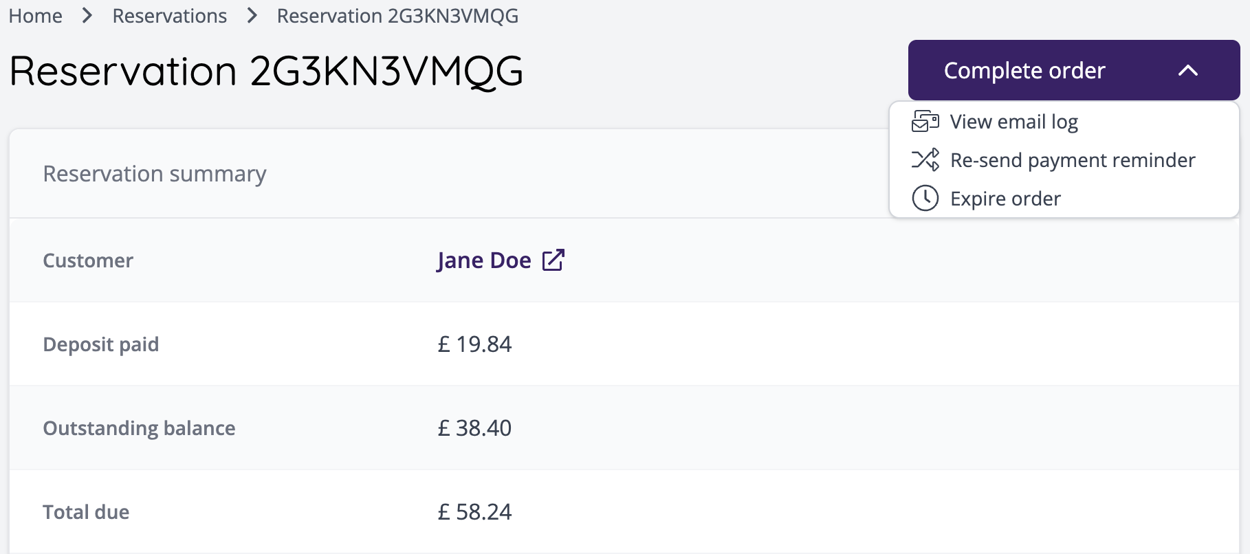 These can be viewed by going to Sales & Reports > Reservations. From here, a payment reminder can also be sent to the customer: