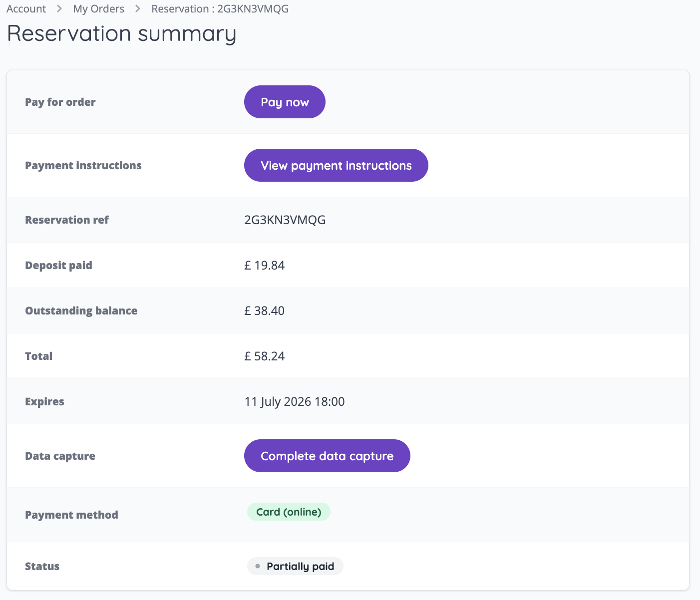 Once a deposit payment has been processed in either the box office or the shop, they will have a period until the event to pay the outstanding balance of their order.