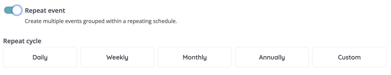 2. When you reach the Repeat event option, toggle it on and choose your preferred repeat cycle from the following options: Daily, Weekly, Monthly, Annually or Custom (for more specific date patterns)