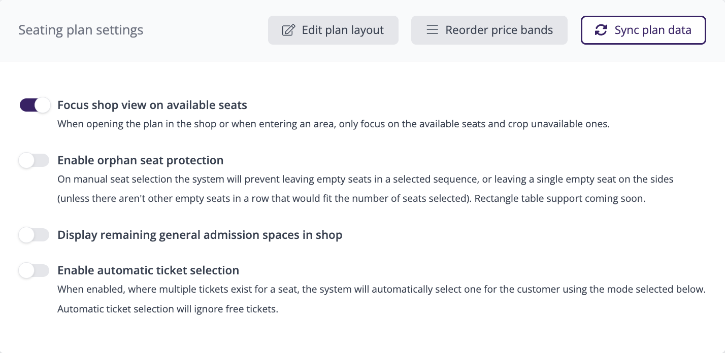 When this setting is enabled and multiple ticket types exist for a seat, the system will automatically assign one to the customer.